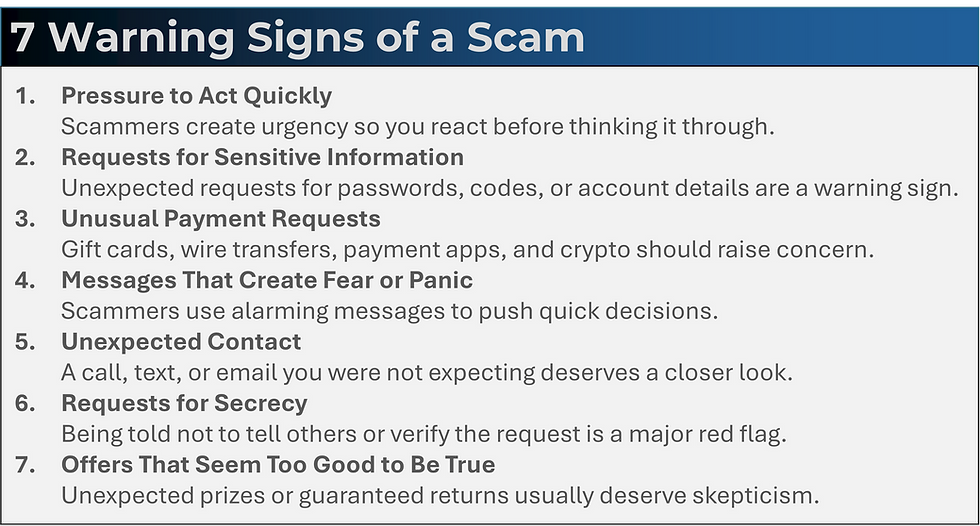 Scammers succeed when people feel rushed, uncertain, or distracted. Recognizing these warning signs helps you respond calmly and confidently.